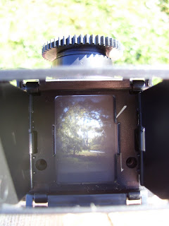The viewfinder and lens are two interlocking cogs, and they screw in and out of the camera. They are calibrated so that when you adjust the lens length, you also adjust the viewfinder length, and this is how you focus. I’ll have to wait until my film is developed to see just how precise this focussing mechanism is.