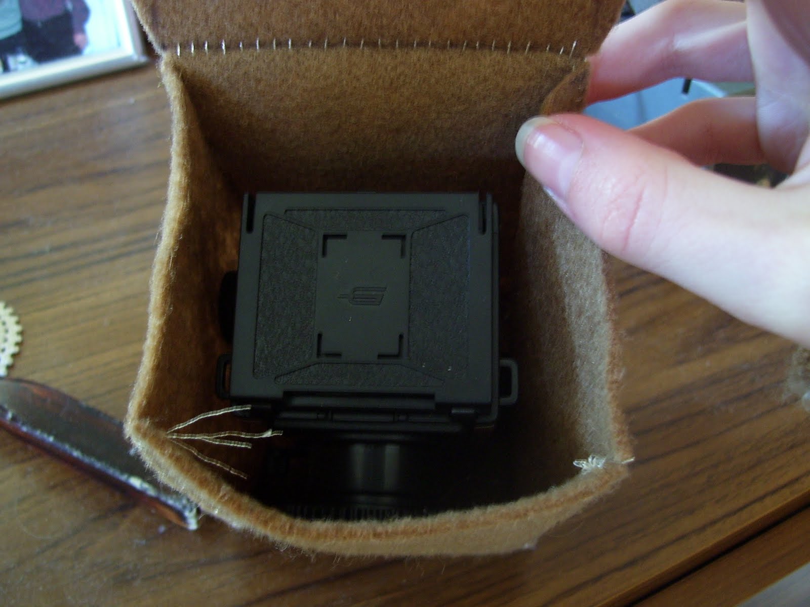 It is amazing that you made camera – it is not something a person makes every day. A camera is usually connected with a point of view, so through the creation of this camera, we can see through your lens…I like its symbolic quality. The colours on the outside texture is awesome and it adds another personal touch. 😀 The leather bag also complements the camera nicely. 😀