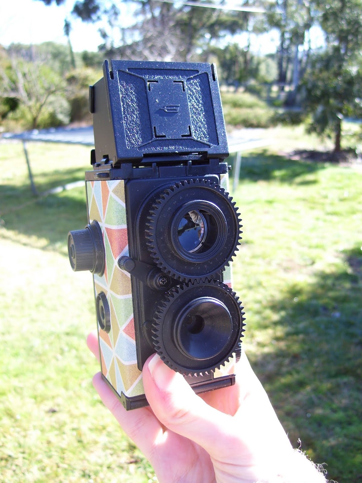 It looks like it has two lenses, but the top one is actually the viewfinder. There’s a mirror that reflects the light from the viewfinder up and out the top of the camera, through a piece of foggy plastic. Looking inside the camera there’s a little screen showing you the world in front of the camera. It’s like looking at a movie in there!