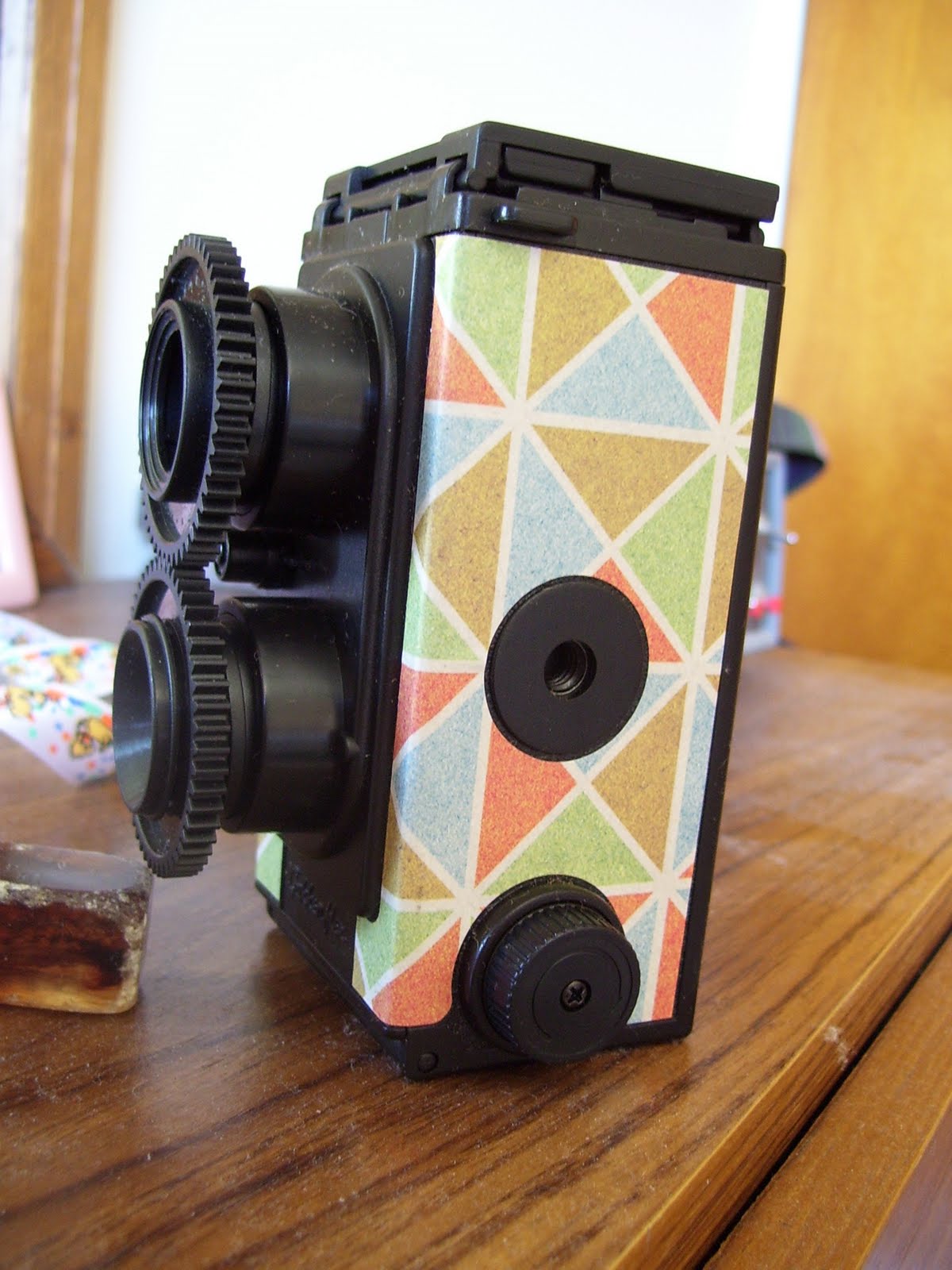 The magazine is in Japanese, so we couldn’t actually understand too much of the instructions. The pictures were really clear so we managed without a translation. We started out with lots of little bits of plastic and screws and gradually built this camera from near scratch. It was fascinating to learn about how the shutter works. When we finished, I stuck some stickers on the outside. I could choose from this design or a woody looking one. I think this one is way cooler.