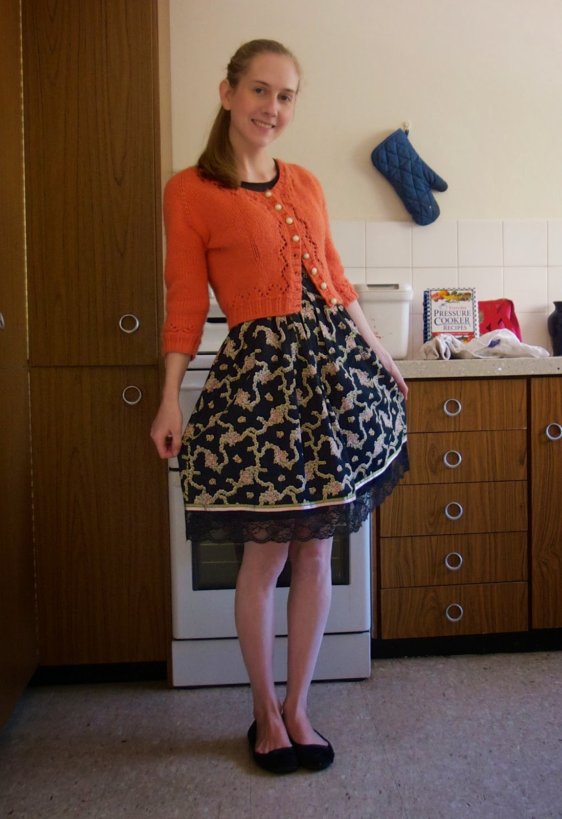 Today I wore a dress I don’t like very much, even though it’s pretty. I bought it from Modcloth about a year ago and it was just way too big on me. I put elastic in the waist and put a pleat right through the back to bring it in. It’s still not a great fit though, and somehow it’s super itchy? I don’t know. The things I do for you.