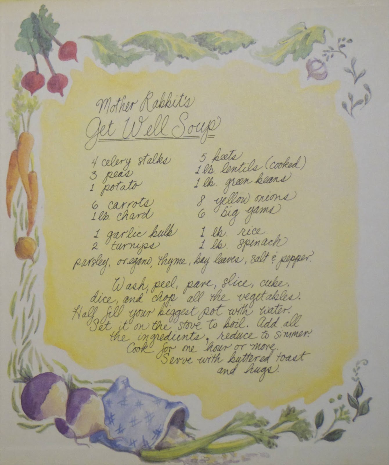 This is the heartwarming tale of Mother Rabbit who wanted to make some nice get-well soup for her six sniffly baby bunnies.