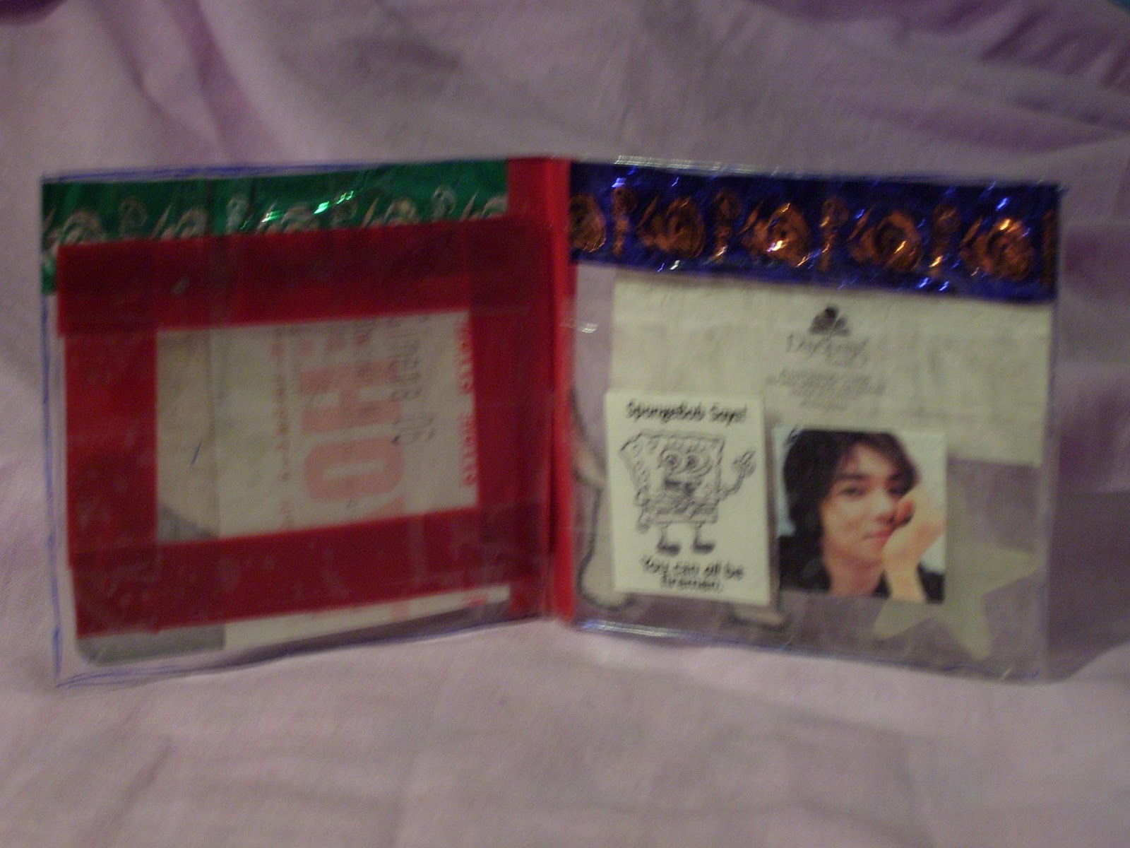 First I decided on the pattern of things to put in the wallet. Then I made a rectangle of tape with each strip overlapping a bit. Then I put the items on the tape and stuck them down. Then another layer of tape was put on top to seal it in. I made another one the same way. Then I made them into a kind of envelope, using the red electrical tape to hold the sides together.