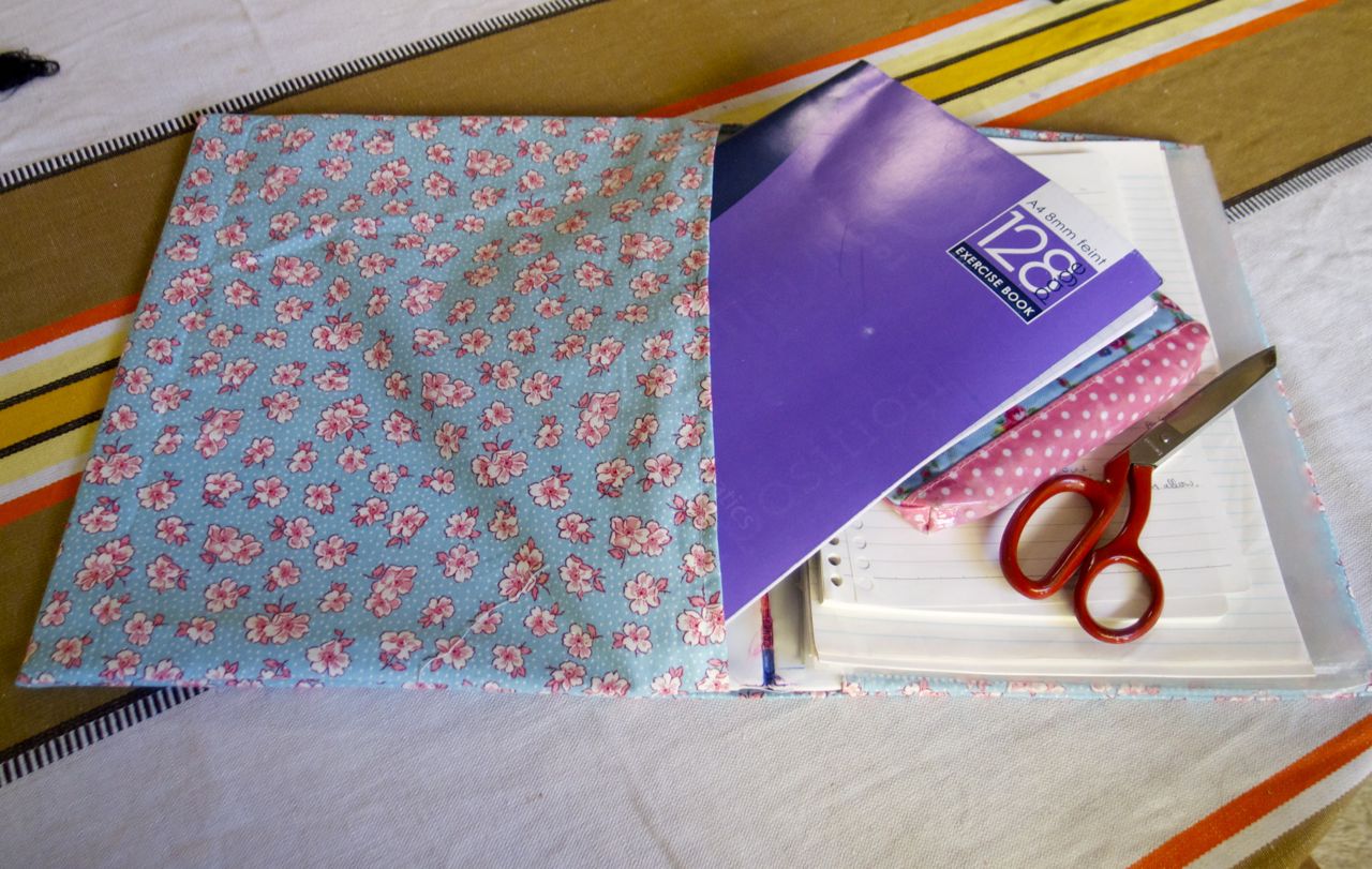 You’ll end up with a long piece of fabric the same height as your folder. Wrap it round the folder and mark where you need to sew to, and sew it up right-sides-together. Turn and slip it on your folder!