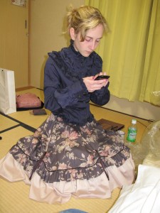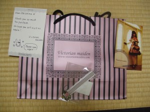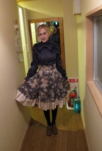 At the VM shop, there was a small ante-chamber where there was a mannequin and some bits and brochures. The main room had several racks of clothes, two small tables and a display cabinet with beautiful hair things and jewellery and ornaments, a fitting room, and the soundtrack was Easy Piano Duets (a book I know well). Frilly parasols adorned every other place. Everything was old-fashioned and pretty. The shop girl was extremely cute and helpful, although she couldn’t speak a word of English. I tried on lots of clothes, many were too big for me. Every time I was interested in a dress she went and got a different colour for me in case I was interested. She was most helpful!