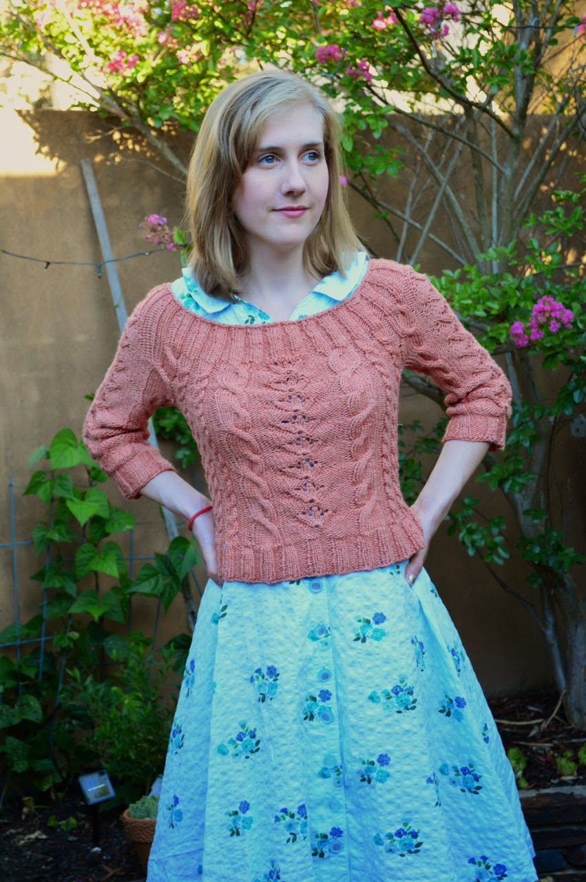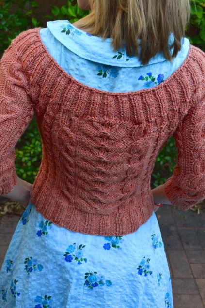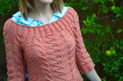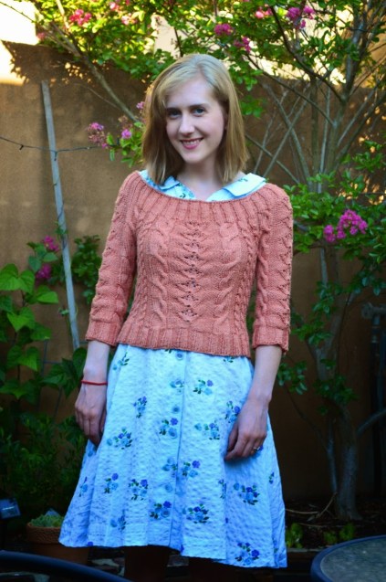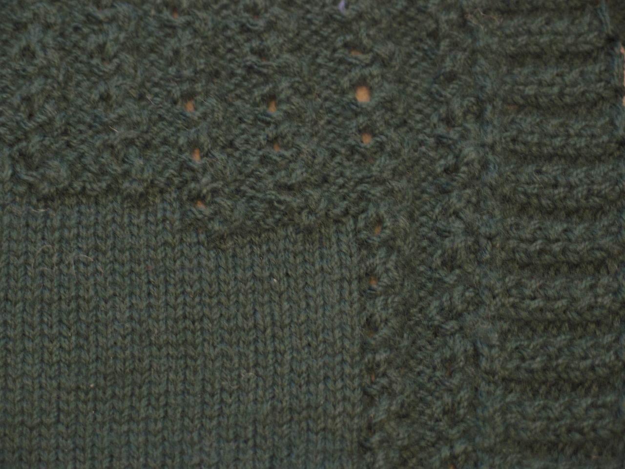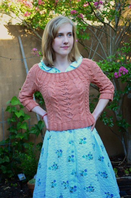 I made quite a few modifications to the pattern. I didn’t do any 1×1 ribbing (because who has time for that), I altered the back slightly to lower the neckline, I made the armholes bigger, and completely changed the sleeves. The sleeves I knit flat, bottom-up, and increased ad lib to the armpit, then cast off ad lib for the sleeve head. I detailed all of this in my ravelry notes. It worked out pretty well IMHO. The pattern was free, and only in one size, so everything was fairly lucky!