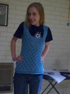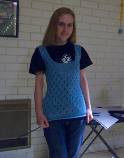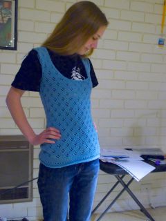This jumper is pieced – front, back, arms, and then the neckline is picked up and knitted. The front and back are worked exactly the same except for the neckline. Arms are symmetrical. It was a pretty easy pattern to follow once I worked out the lace pattern.
