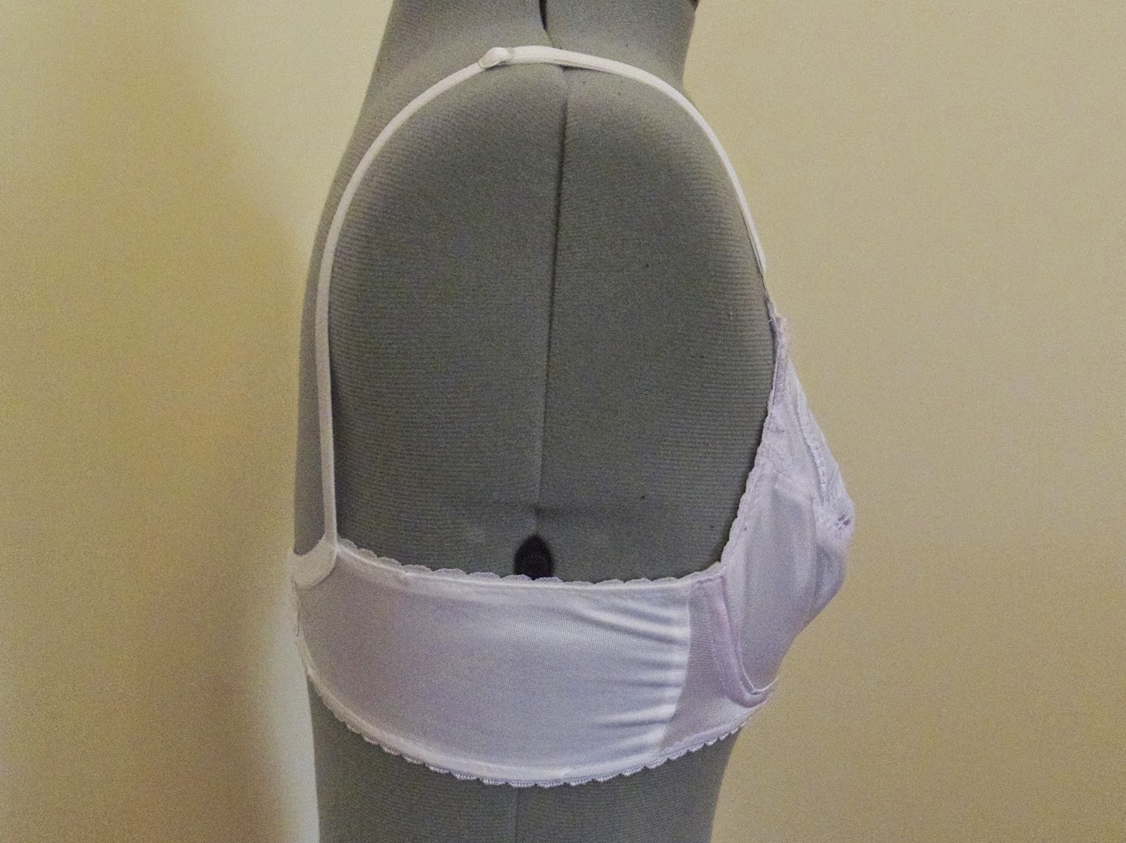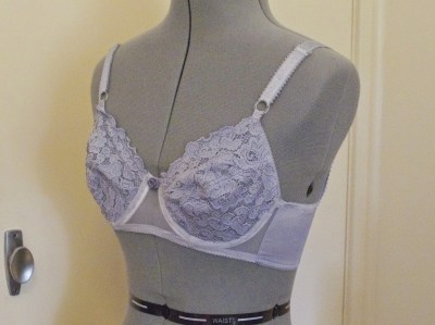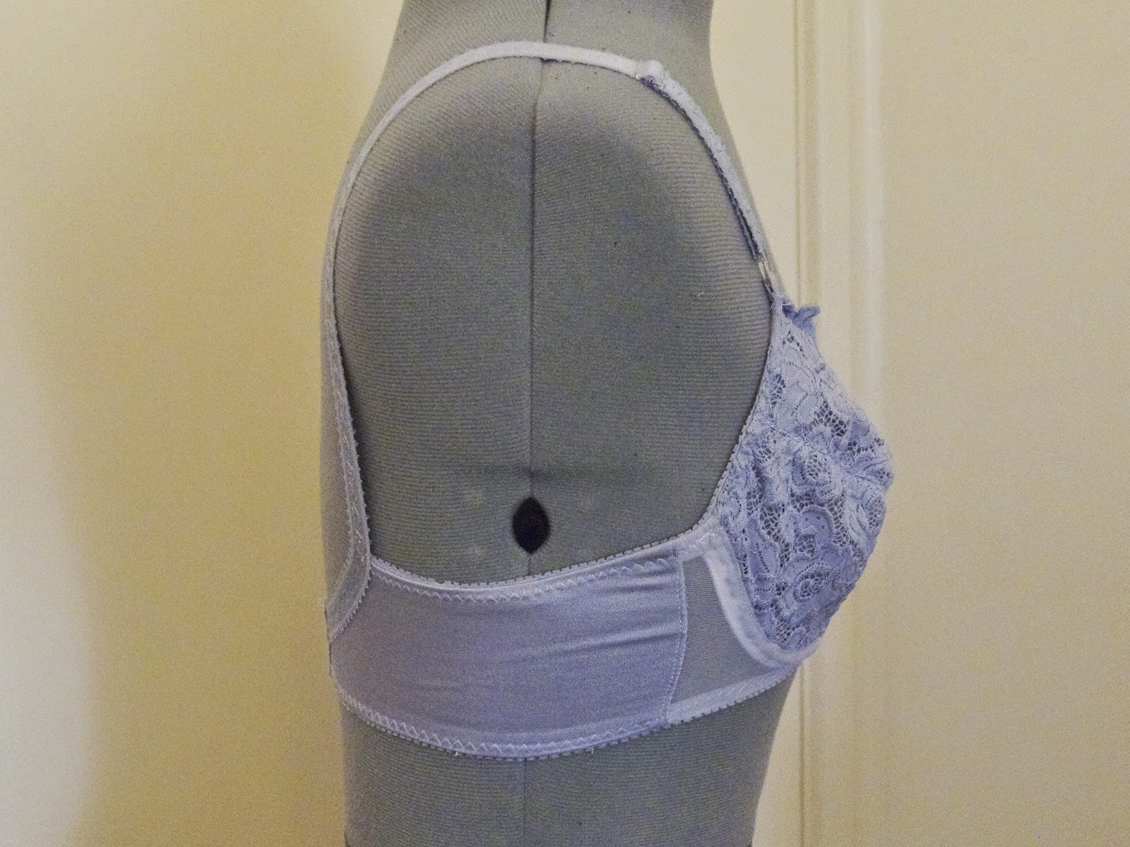 The tricot mesh that came with this kit was much much thinner than the one we used at the workshop, which meant I had to put lace on the upper and lower bra cups (for modesty). You can see at the front the dressform’s grey skin is showing! So obviously I had to put lace on it!
