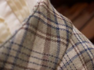 I got this fabric from a bizarre church sale where they were only selling fabric and patterns for super cheap.  It’s pinstripe suiting.  I lined it with spots!