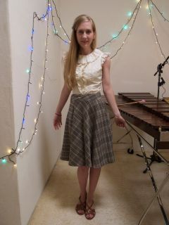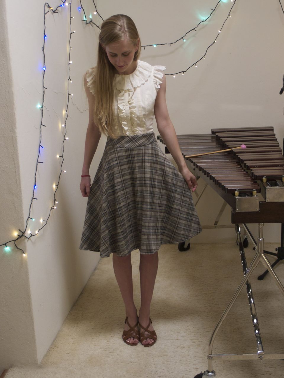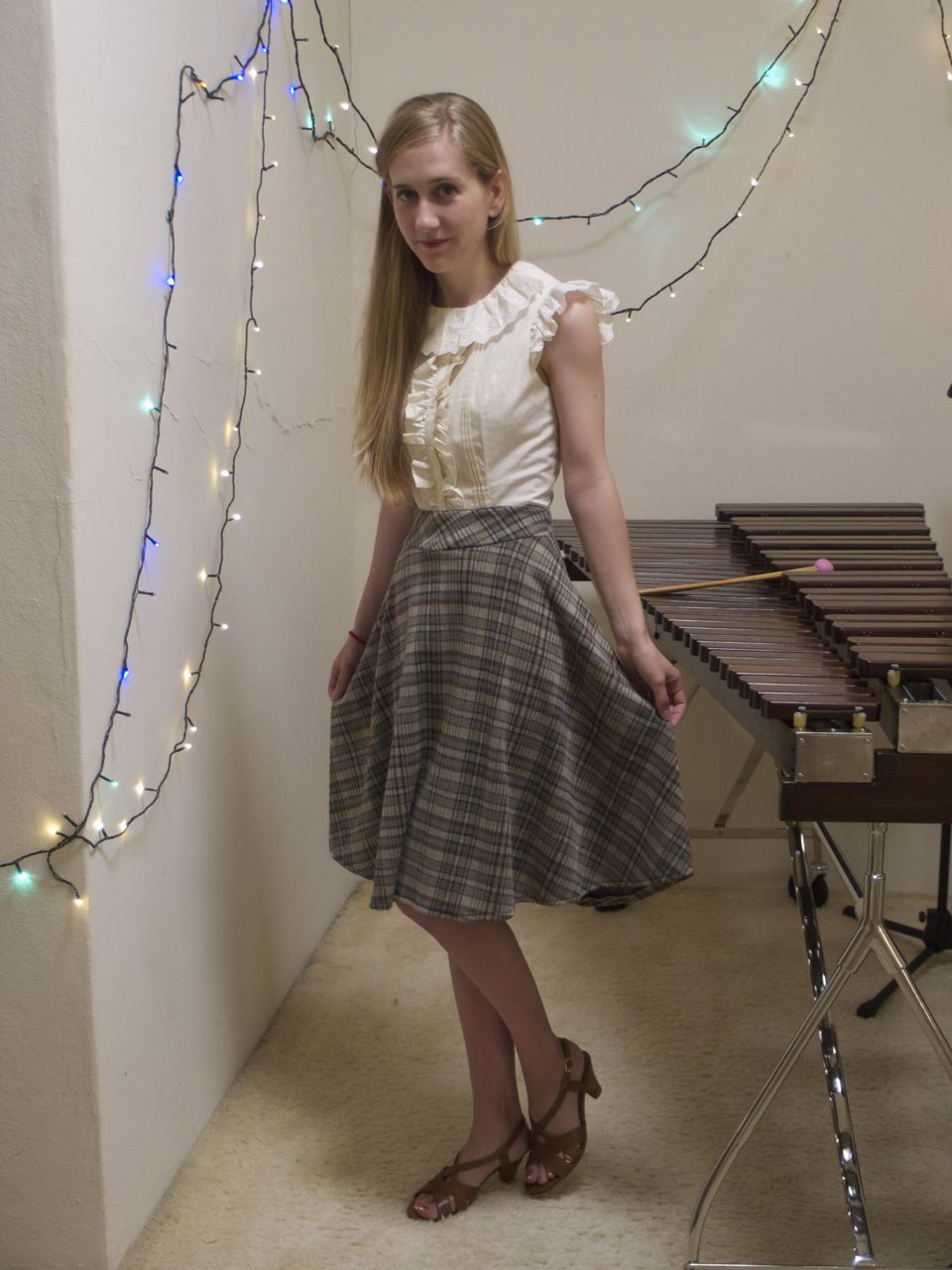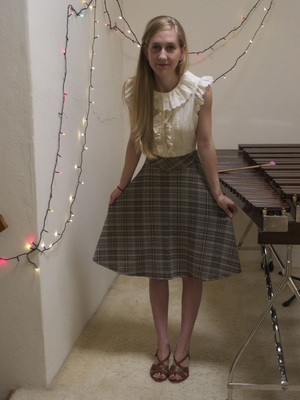 The skirt is made of four box-pleats.  So the skirt is made of a rectangle of length 3*hip measurement, and then folded into box pleats.  There’s a zipper at the side and it’s all attached to a simple wide waistband that goes from my hips to my waist.