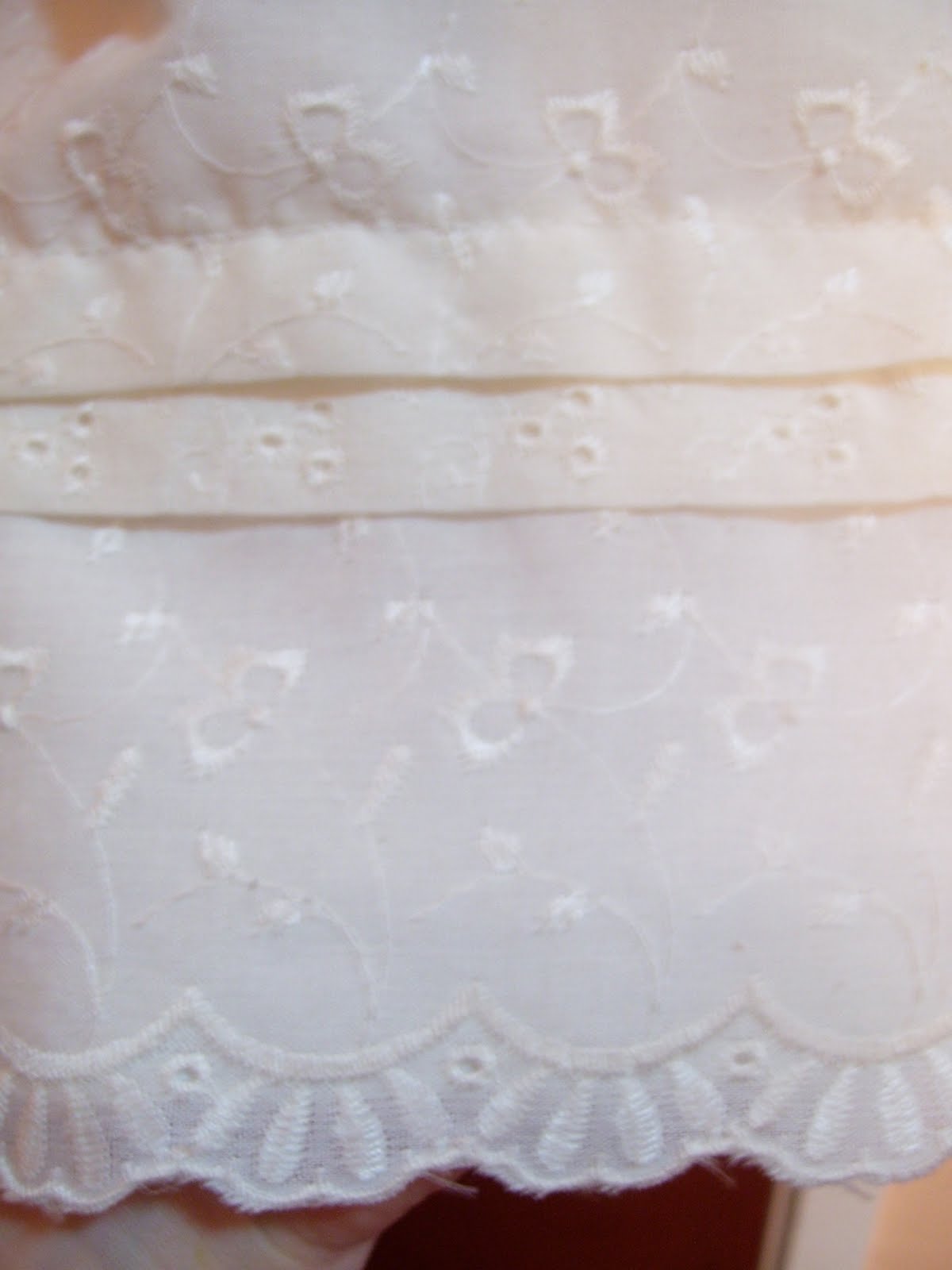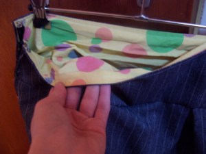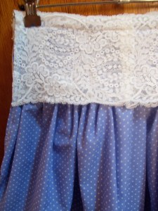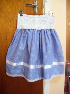 Here it is in its natural habitat. Fabrics: Blue and white polka dot cotton, stretch lace, normal lace, ribbon, zip.