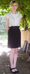 This is another R-Series blouse I bought from Qutieland. This blouse is practically perfect in every way, plus it was a lot cheaper than brand. The fabric is a light polyester (I guess) that feels gorgeous against my skin. The blouse has corset lacing so I always fit well. I adore the buttons – little faux pearls – and the details. I’m considering buying myself another one while they are still for sale. Mine has been loved almost to death! The buttonholes are fraying and the pearl paint is coming off the buttons. It’s getting a little pilly. But it’s still so beautiful. I wear this with the above dress and it’s lovely.