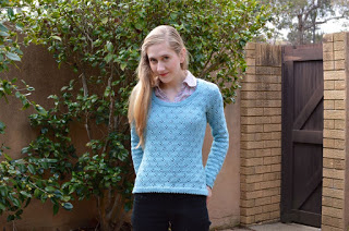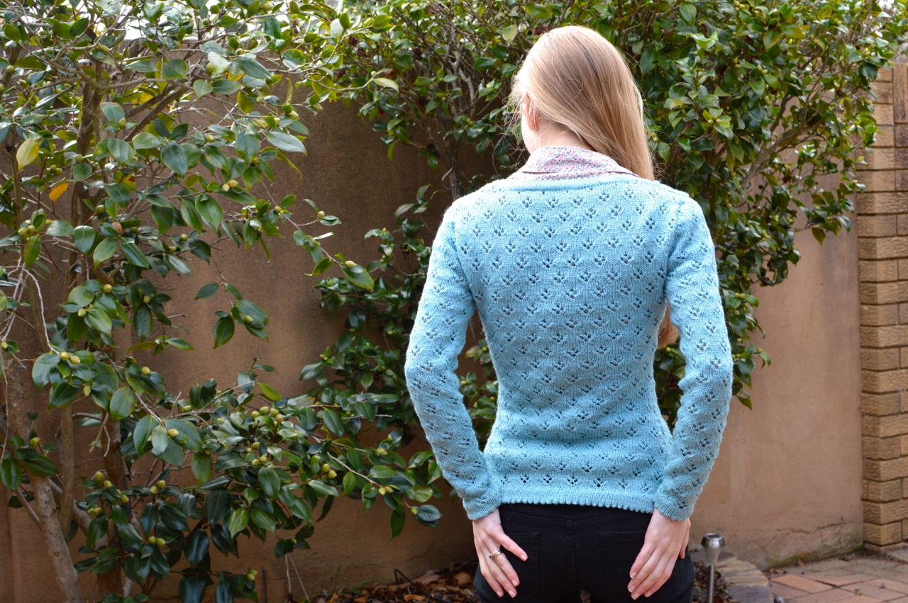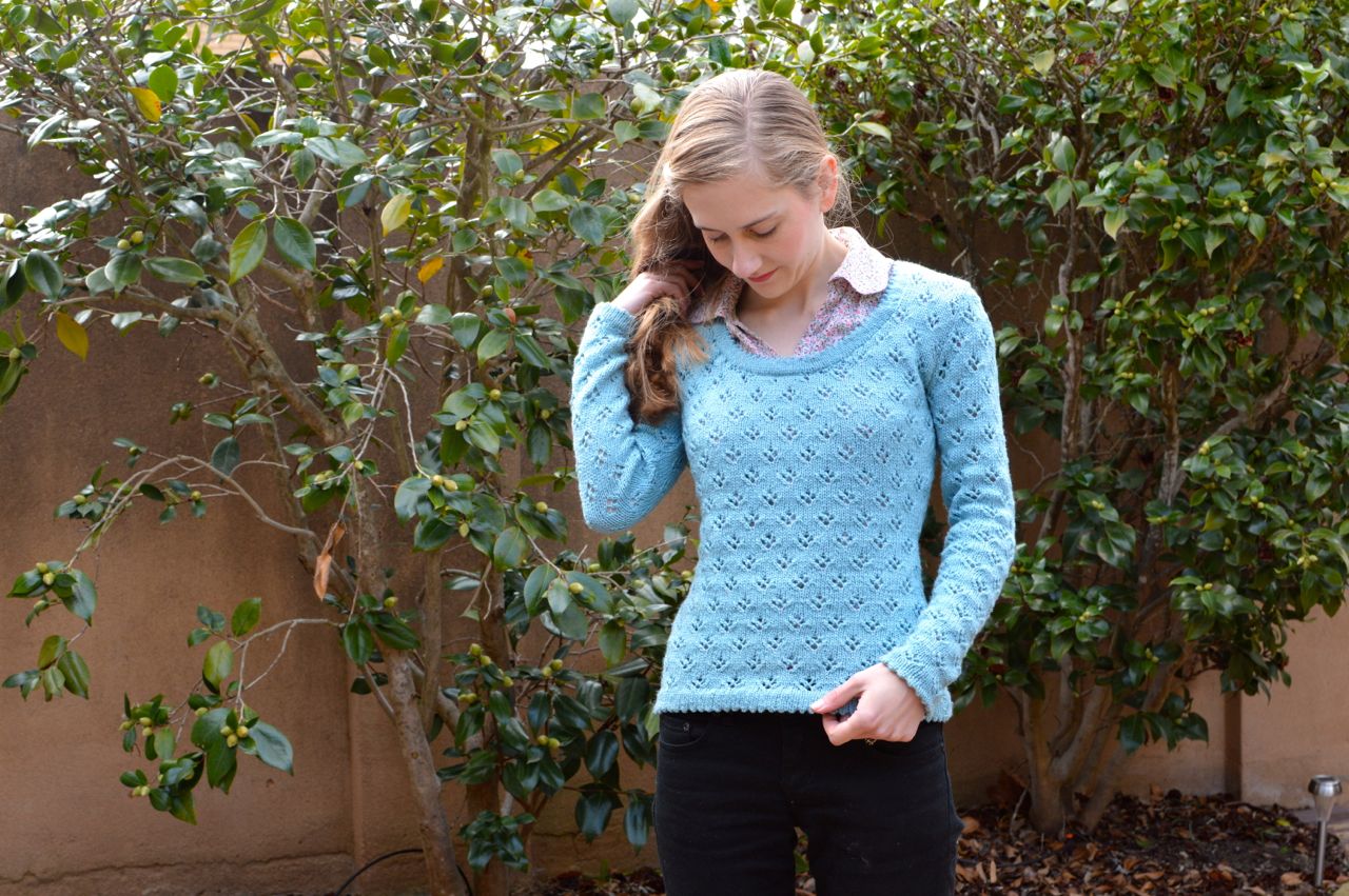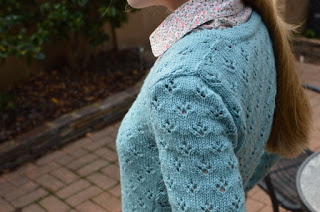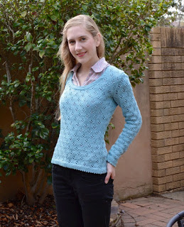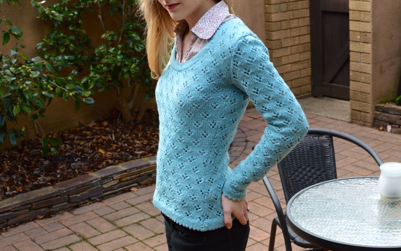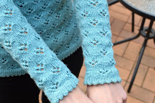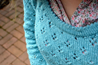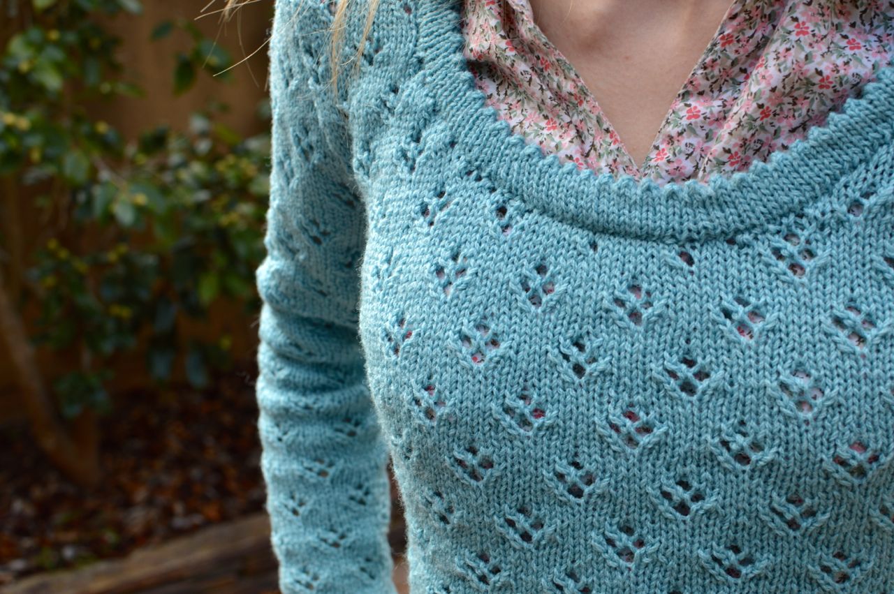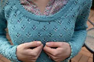 This jumper is pieced – front, back, arms, and then the neckline is picked up and knitted. The front and back are worked exactly the same except for the neckline. Arms are symmetrical. It was a pretty easy pattern to follow once I worked out the lace pattern.